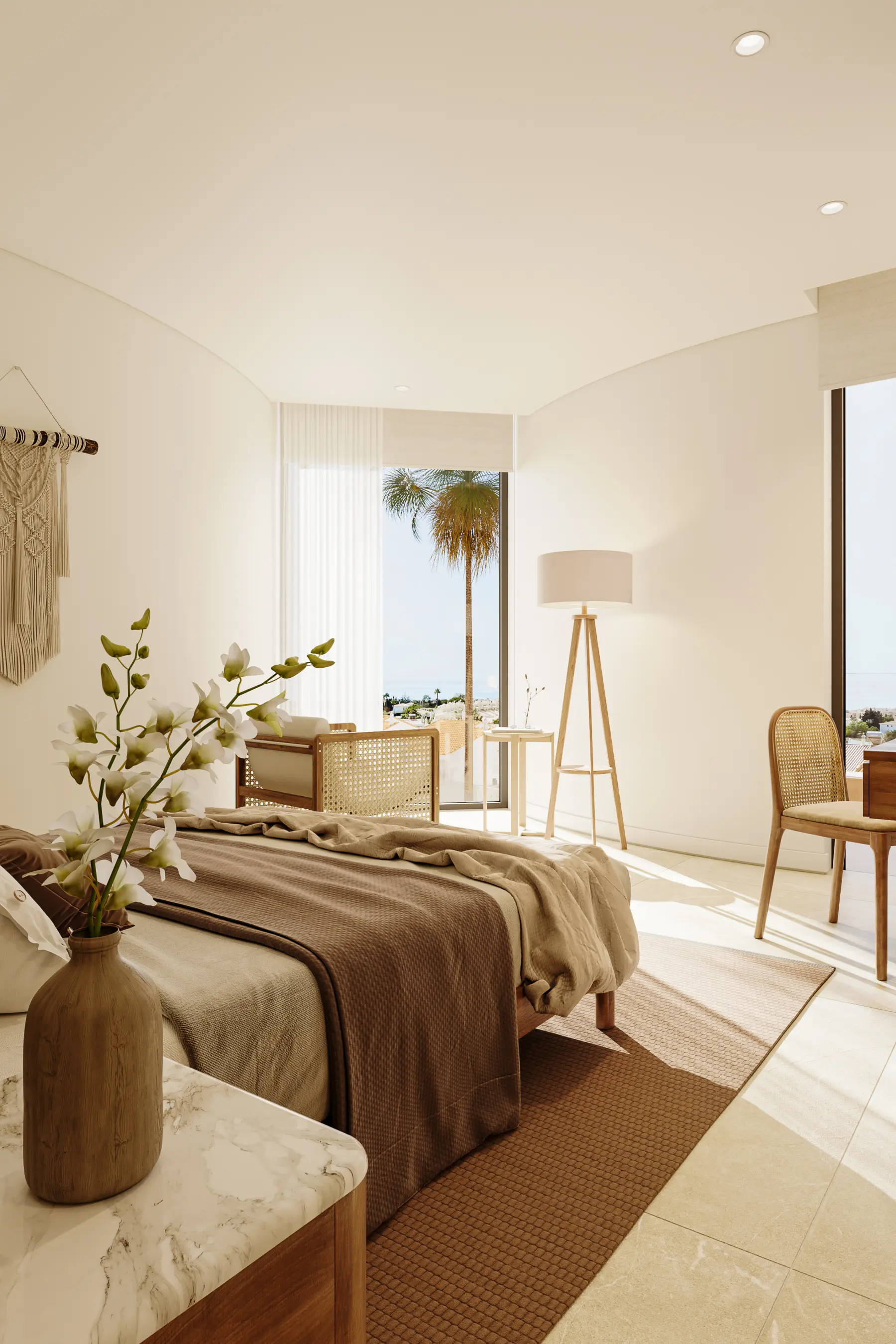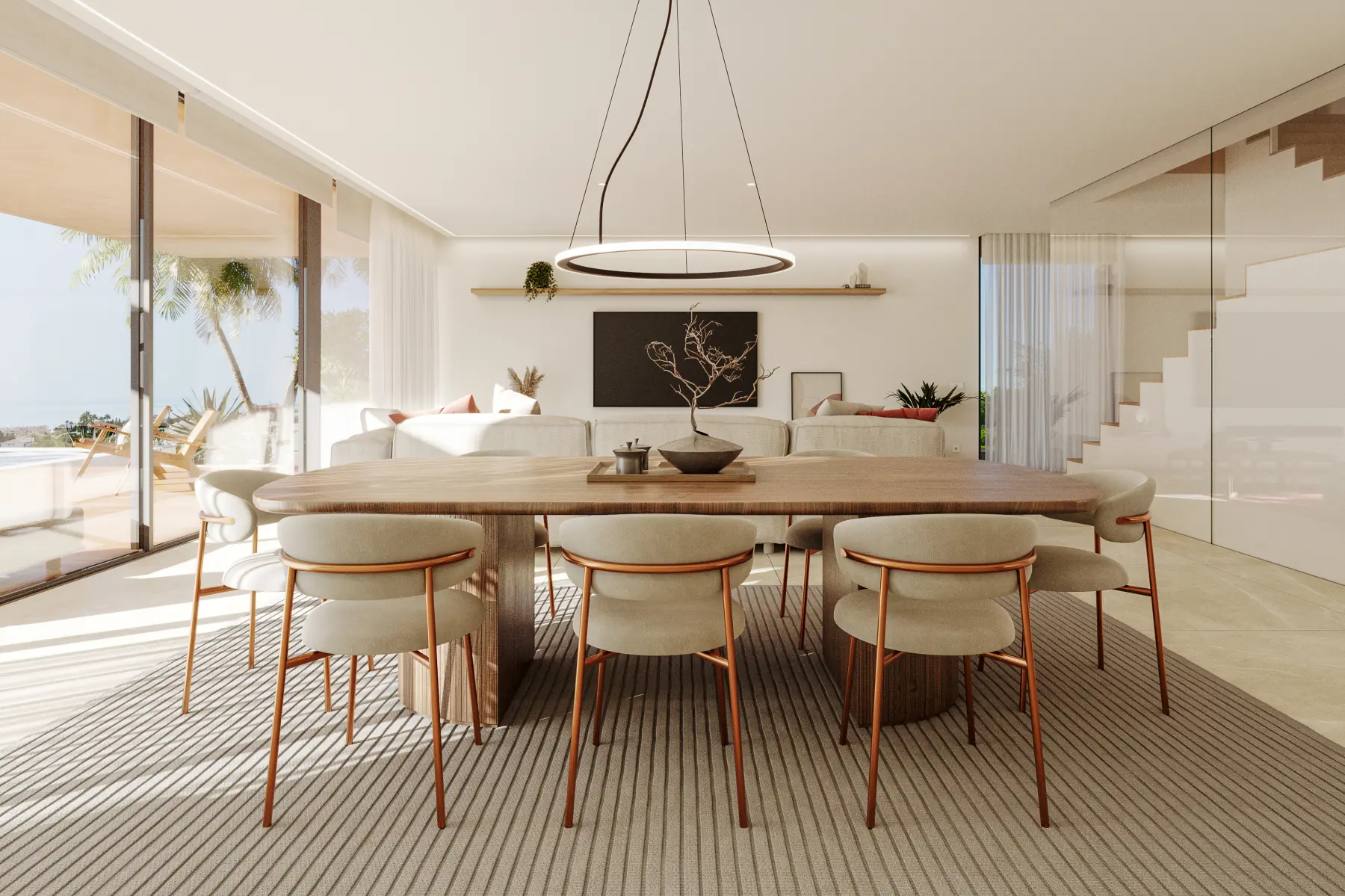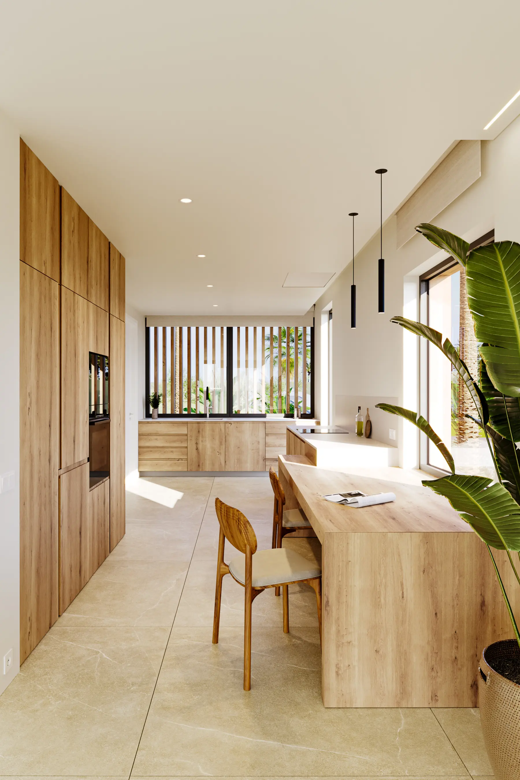 With a strong relationship with nature, interior spaces are constantly 'invaded' by natural elements. Large openings, or even the big palm tree crossing the house structure on the south side, reinforce this relationship with the natural environment.